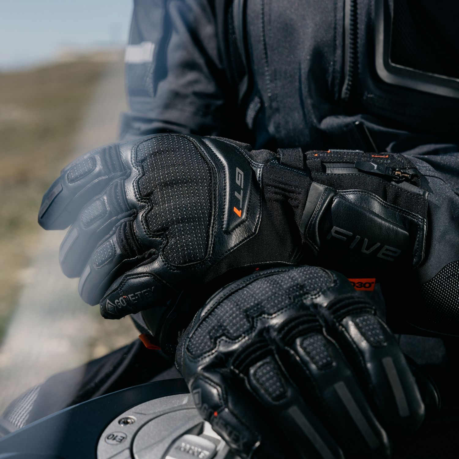 El guante de moto Five GT1 EVO GTX te llevará hasta el fin del mundo. El guante de touring definitivo, repleto de innovaciones, el GT1 EVO GTX tiene todo lo que necesitas para recorrer kilómetros con total comodidad: piel flexible y construcción Syntech Skin™, membrana GORE-TEX® Grip™, aislamiento térmico ligero Primaloft® de 80gr, protecciones ERGO PROTECH® en D3O® y un limpia pantalla ergonómico. ¡Lo hemos superado para que puedas viajar muy lejos!